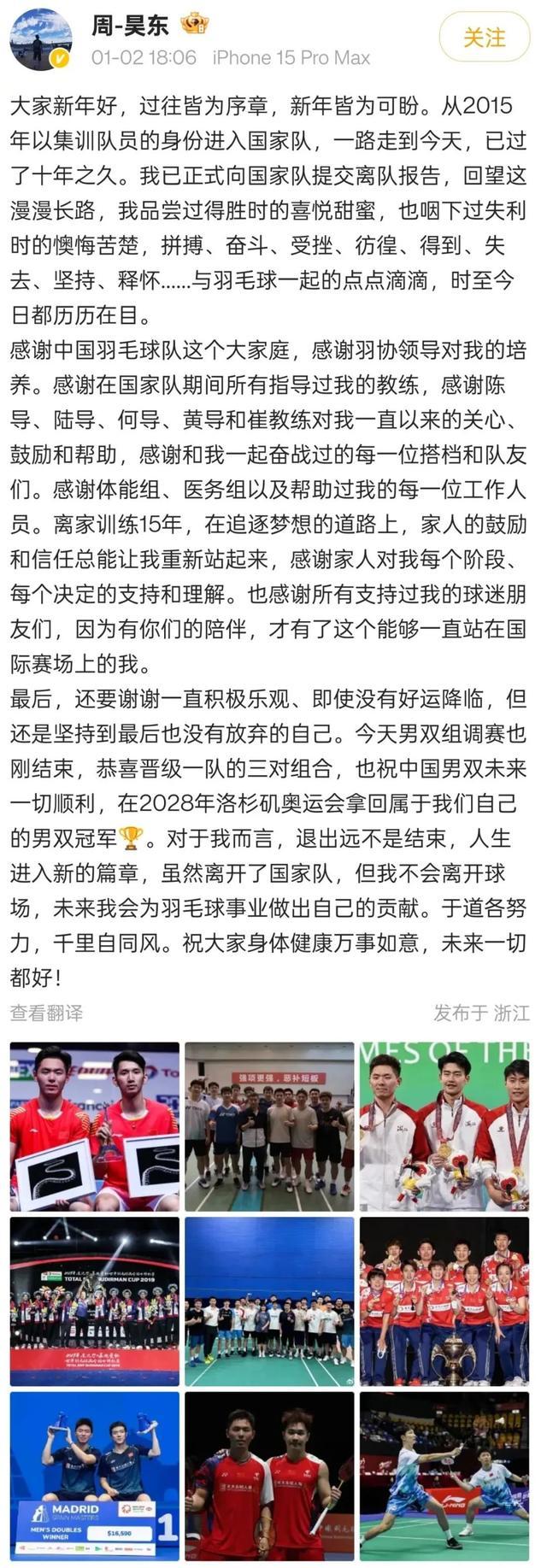 1月2日傍晚,中国羽毛球队队员周昊东在个东说念主微博布告新音信,其已厚爱向国度队提交离队讲明。他默示,退出远不是抑止,诚然离开了国度队,但他不会离开球场,将来会为羽毛球功绩作念出我方的孝顺。