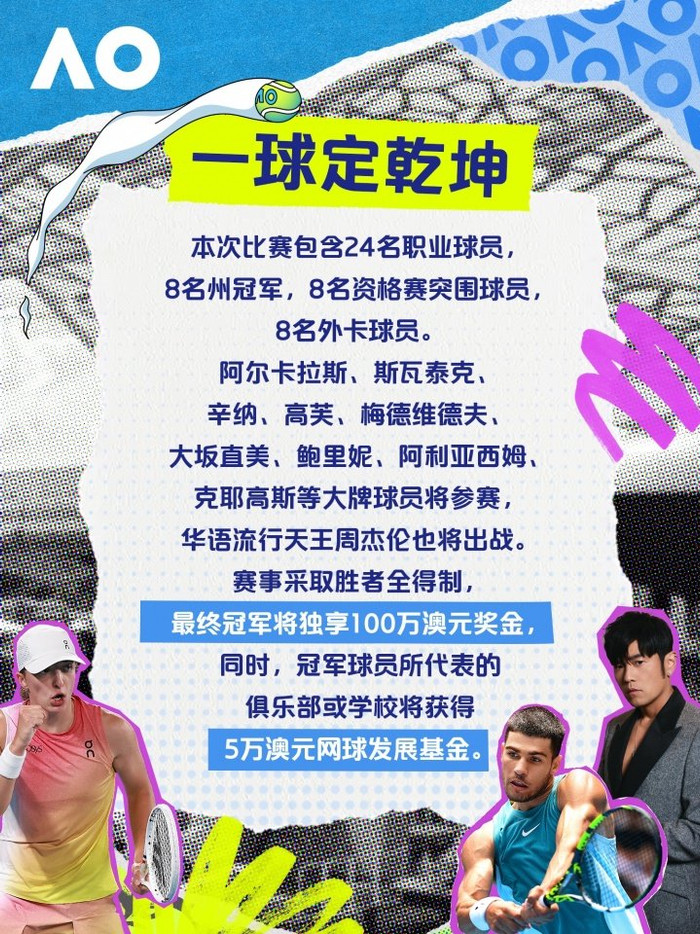 这项全新的赛事将至今天进行,比赛遴荐老例淘汰赛制,通过“石头剪刀布”决定发球权或接发球权。行状球员和业余选手通过打一分的神情进行淘汰赛,最终的冠军不错赢得100万澳元的奖金,约为471万东谈主民币。